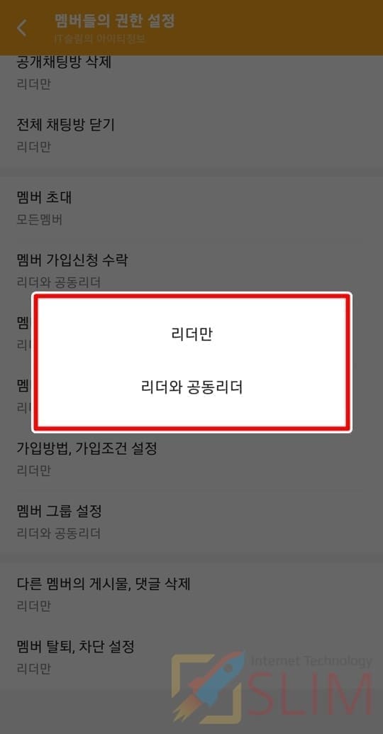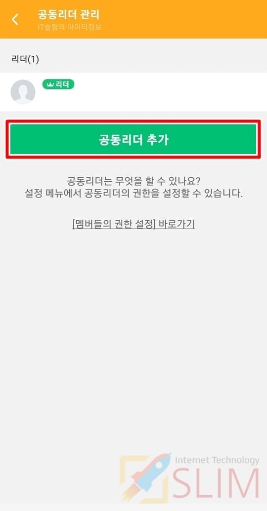 이렇게 위임해줄 경우 본인은 일반 멤버로 변경되게 됩니다. 이것이 싫으시다면 아래의 공동 리더로 운영진을 추가해보세요.