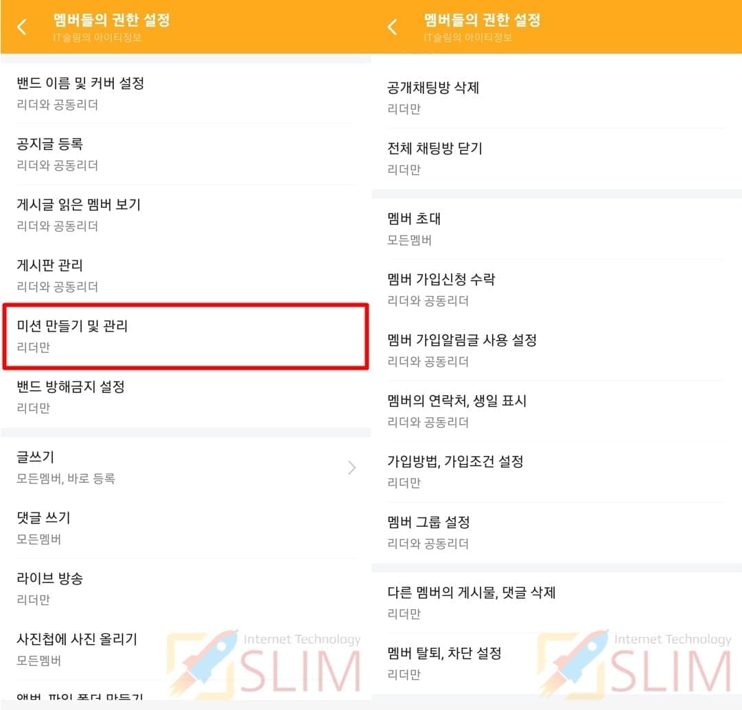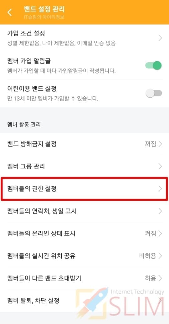 1. 밴드 설정 화면에서 멤버들의 권한 설정을 클릭합니다.