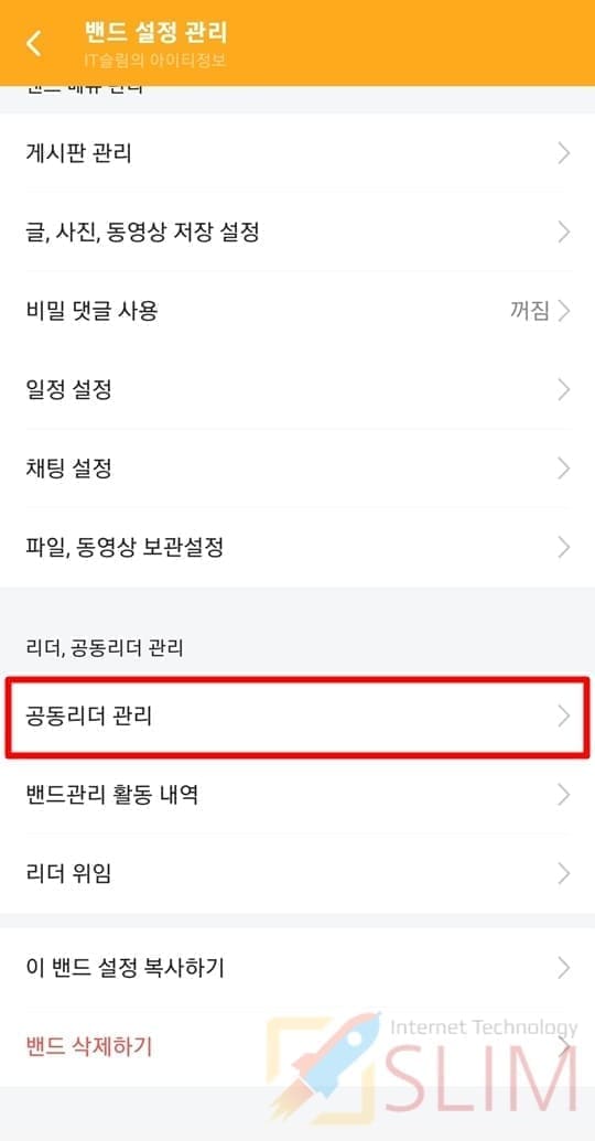 1. 밴드 설정 화면에서 공동리더 관리를 클릭합니다.