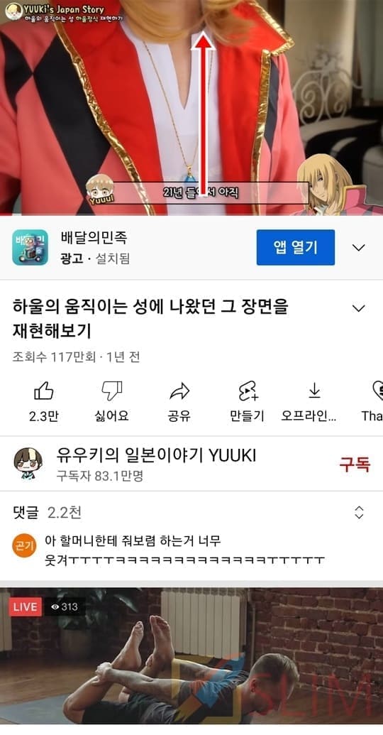 1. 유튜브 동영상 세로모드 화면을 아래에서 위로 드래그합니다.