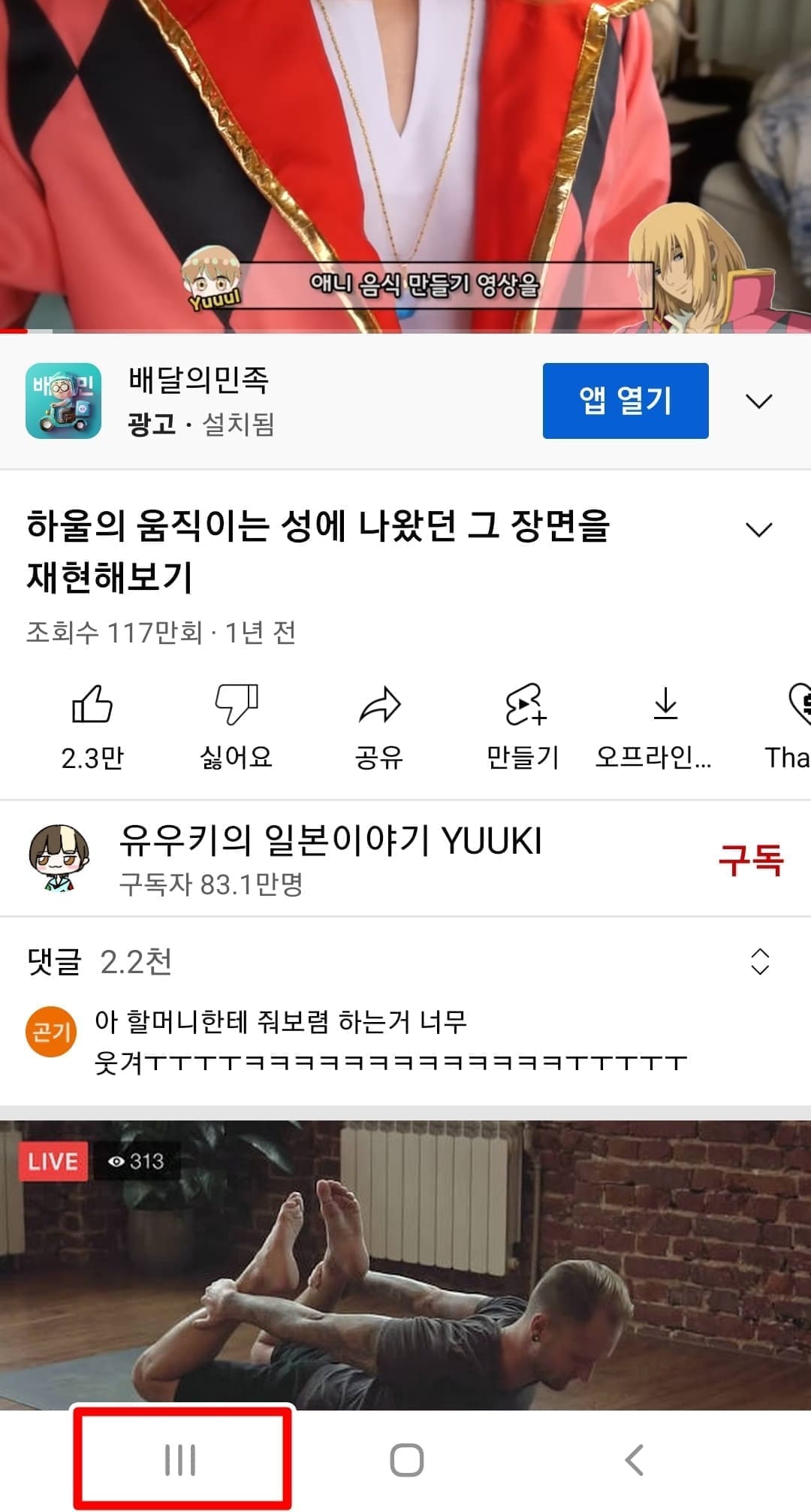 1. 유튜브 동영상 화면에서 최근 실행 앱 버튼을 클릭합니다.