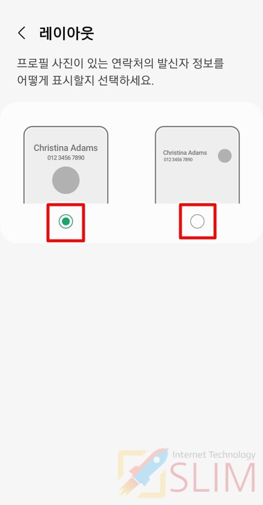 프로필 레이아웃은 전화가 수신되었을 때 화면에 상대방의 발신자 정보를 어떻게 보여줄지 선택하는 디자인을 말합니다. 좌측을 선택한 경우 이름, 전화번호 및 상대방 프로필 사진이 나란히 세로로 보여지고 우측을 선택한 경우 이름과 전화번호는 세로 및 오른쪽 부분에 프로필 사진이 보여지게 됩니다. 미리보기 형식이 제공되니 가장 마음에 드는 레이아웃으로 골라보시길 바랍니다.