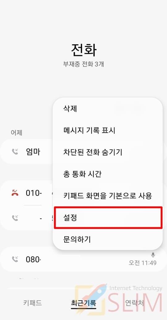 1. 전화 앱 > 더보기 > 설정 > 앱 사용 중 수신 전화 화면을 클릭합니다.