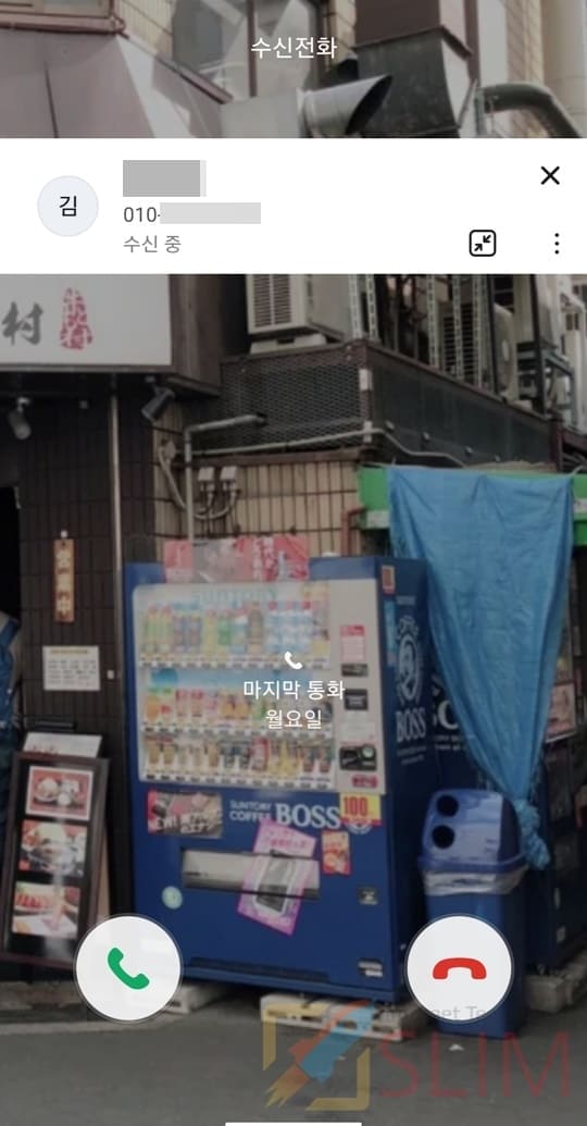 배경 사진만 변경이 된 모습으로, 초록색 통화 버튼을 눌러 전화를 수신하거나, 빨간색 통화 버튼을 눌러 통화를 종료하는 것도 가능합니다. 즉 기능적인 부분은 그대로 사용할 수 있고 배경의 디자인만 바꿔서 이용하는 것이니 참고하시길 바랍니다.