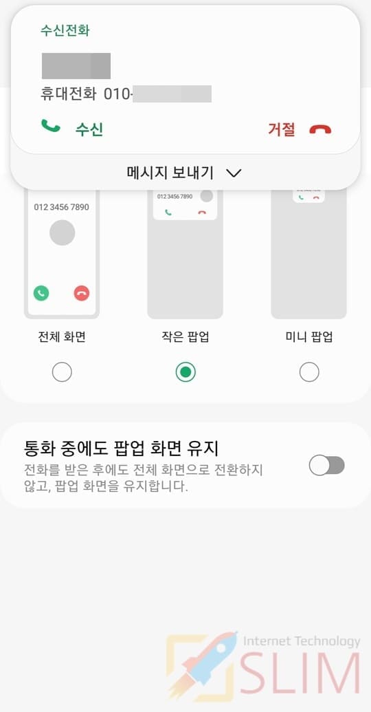 좌측에서 순서대로 전체 화면 / 작은 팝업 / 미니 팝업의 모습입니다. 전체 화면은 기존의 기본 설정으로 전화가 수신되면 앱을 사용하더라도 전체 화면으로 가려지게 됩니다. 작은 팝업의 경우에는 상대방이름, 휴대전화번호, 수신과 거절 버튼이 보여지고, 미니 팝업의 경우에는 이름 또는 휴대전화번호만 간략히 하나만 표시될 뿐만 아니라 팝업의 사이즈가 더 축소되어 표시됩니다.