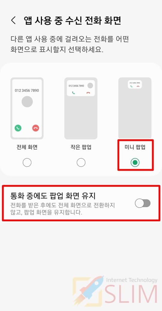 제가 개인적으로 꼭 소개드리고 싶은 기능으로 '통화 중에도 팝업 화면 유지'를 활성화하여 이용하는 것을 추천드리고 싶습니다. 전화를 받을 경우 전체화면에 전화 수신화면이 가득 표시되게 되는데요. 이 때 통화중에도 팝업 화면 유지를 활성화해두면 전화를 받은 후에도 전체화면으로 전환하지 않고 팝업 화면을 유지할 수 있어서 사용중이던 앱을 이용하며 편리하게 전화를 받을 수 있기 때문입니다. 그래서 설정을 강력추천드립니다.