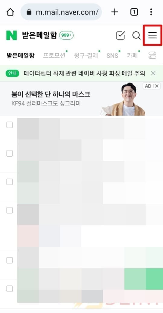 4. 메일함 화면 우측 상단에서 메뉴 버튼을 누릅니다.