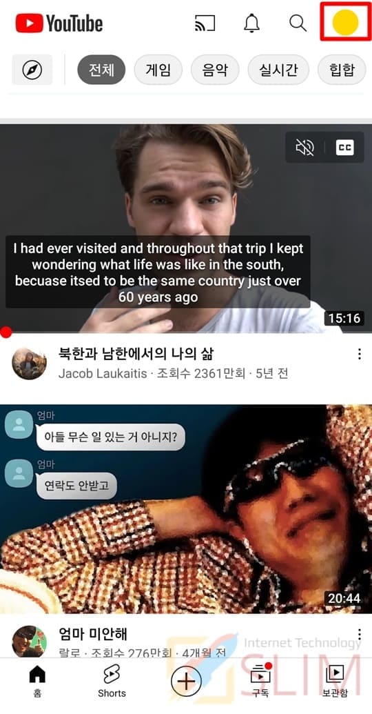 1. 유튜브 앱에서 내 프로필을 클릭합니다.