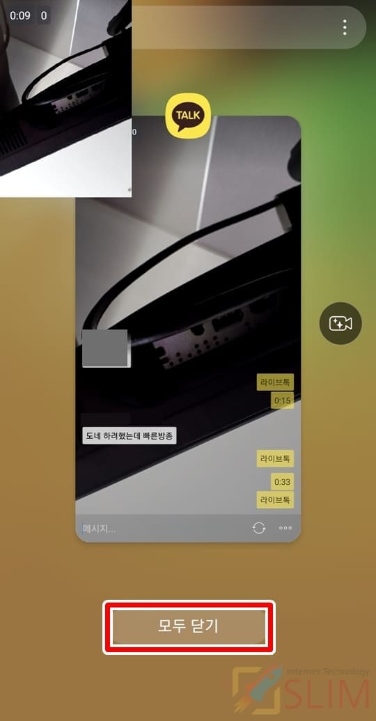 라이브톡 끄는법 두번째는 제가 많이 활용하고 있는 방법입니다. 바로 스마트폰의 기능인 '최근 실행 앱' 기능의 모두 닫기를 이용하는 것인데요. 라이브톡 뿐만 아니라 현재 실행중인 스마트폰의 다른 앱들까지도 한방에 종료시켜주기에 깔끔하여 이용을 추천드립니다.