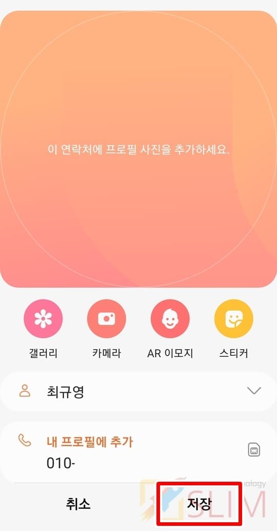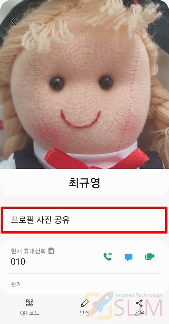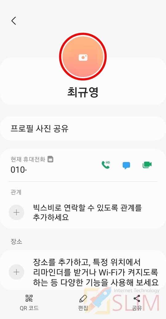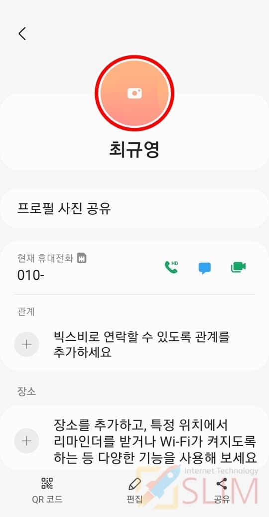 참고로 갤럭시 연락처에 사진을 넣어두신다면 상대방과의 전화나 문자시 보이는 프로필란에 내가 저장한 사진이 나오게 됩니다. 그래서 전화,문자가 왔을 때 누구한테서 연락이 온것인지 한눈에 살펴볼 수 있는 것도 장점이죠. 또 마지막으로 내 연락처에 내가 직접 사진을 넣는 방법도 있는데요. 이렇게 내 프로필에 사진을 넣고 프로필 공유 기능을 이용하면 나의 연락처를 저장한 상대방들의 연락처상 내 프로필에 사진이 자동으로 업로드되게 됩니다. 그래서 나를 보여주고 꾸밀 수 있는 유용한 기능이기도 하기에 나와 친구들의 연락처에 사진을 넣어 활용해보시길 바랍니다.