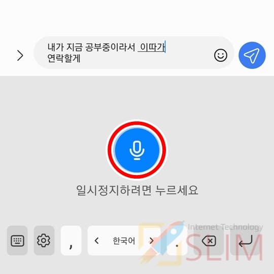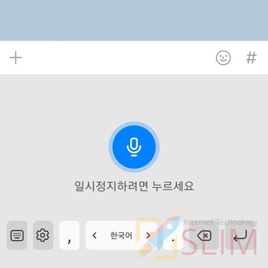 키보드 마이크 버튼을 눌렀을 때에는 음성 인식이 시작됩니다. 이 때 중앙에 있는 마이크 모양 원형 버튼을 한번 누르면 일시정지되며, 일시정지 상태에서 다시 마이크 모양 원형 버튼을 누르면 음성 인식이 시작됩니다.