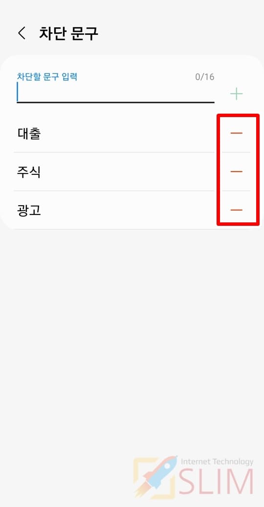 3. 등록된 스팸 차단 문구의 우측 - 버튼을 누릅니다.