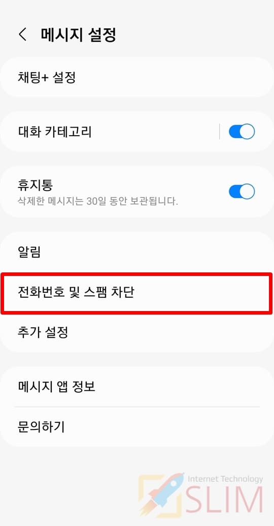 1. 갤럭시 메시지 앱 > 더보기 > 설정 > 전화번호 및 스팸 차단을 실행합니다.
