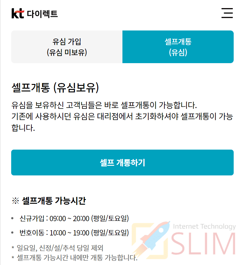 3. 셀프개통을 선택하고 개통하기 버튼을 누릅니다.