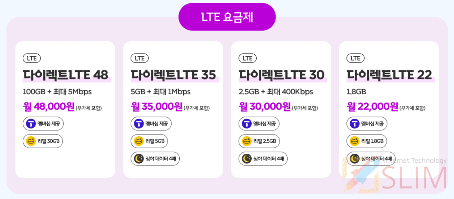 | 다이렉트LTE 48 | 월 48,000원 | 100GB + 최대 5Mbps | 리필 30GB | 멤버십 제공 |