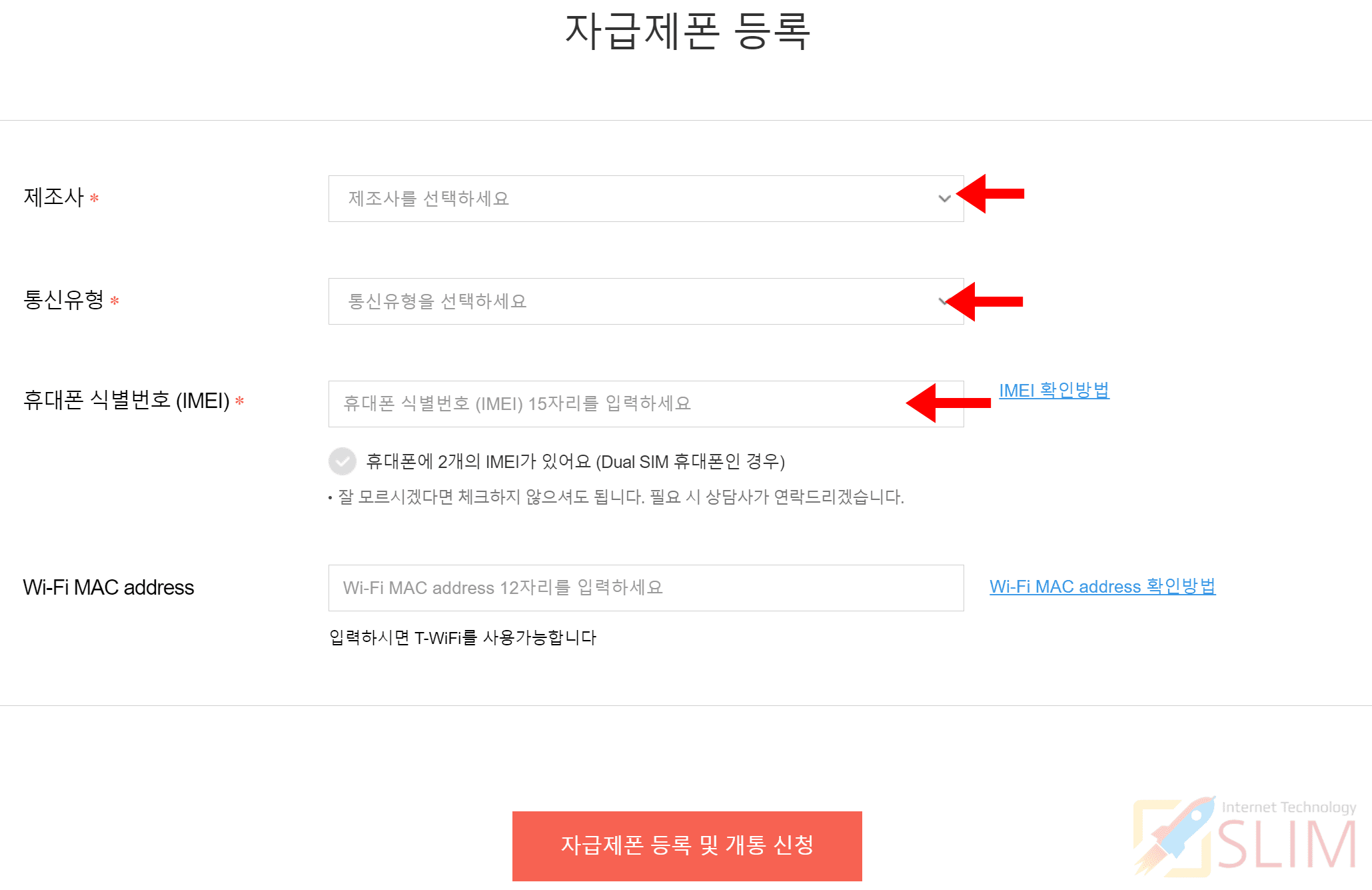 3. 자급제폰에서 확인한 휴대폰 식별번호 IMEI를 입력합니다.