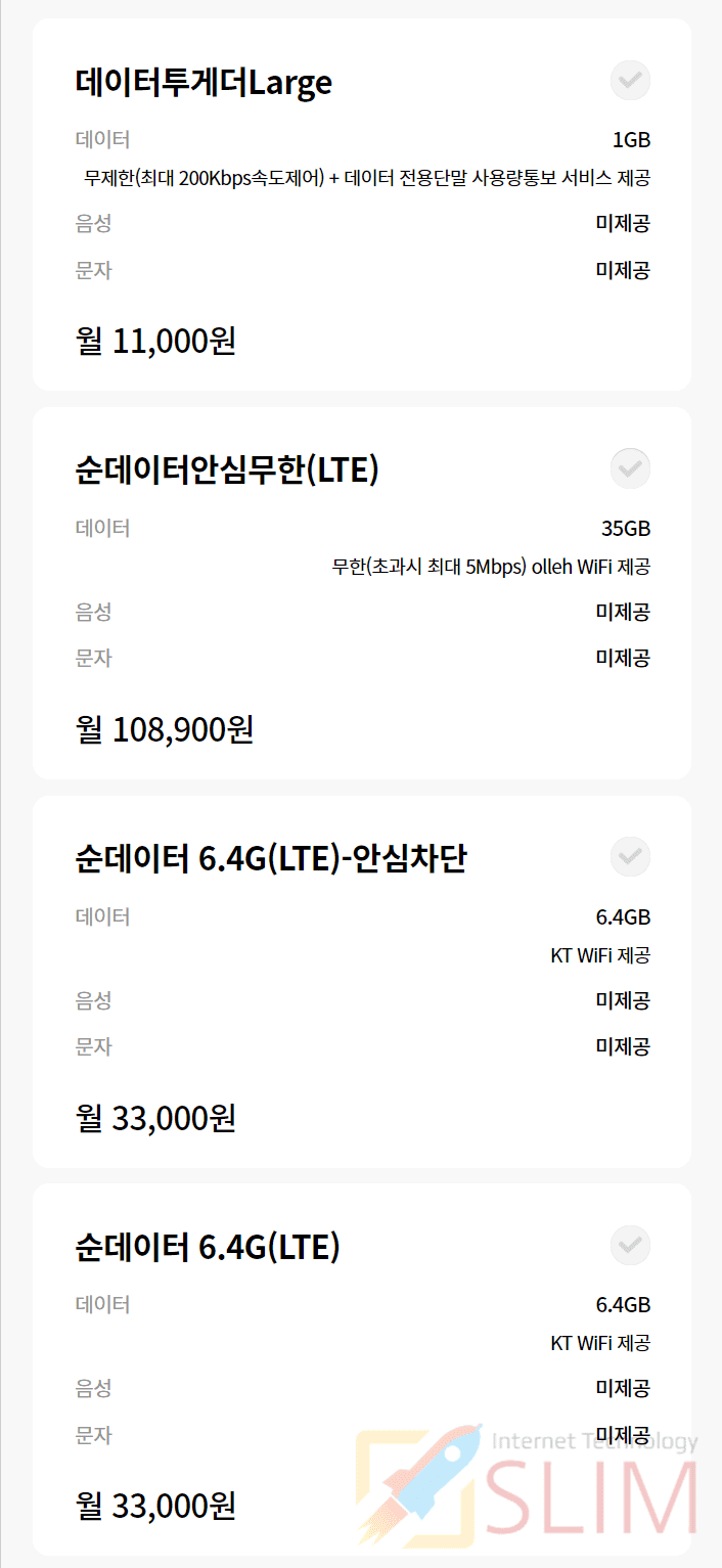 | 순 데이터 3.2G(LTE)-안심차단 | 월 24,750 원 | 데이터 3.2 GB |