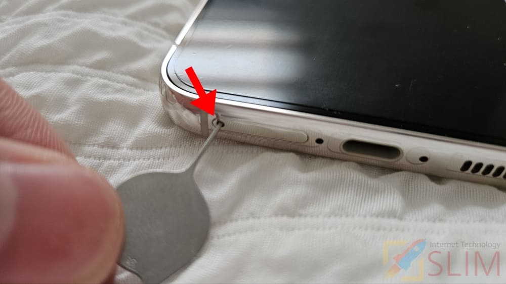2. 유심 트레이 핀을 구멍에 끝까지 넣습니다.