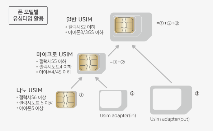 유심칩은 대표적으로 3가지 종류로 나눠지는데 크기가 큰 순서대로 일반유심, 마이크로유심, 나노유심으로 분류됩니다. 참고로 스마트폰 갤럭시의 경우 출시 모델에 따라서 사용되는 유심사이즈가 달라서 주의하셔야 하는데요. 다만 유심 틀을 분리하여 작은 유심칩을 만들어 트레이에 인식시킬 수 있기 때문에 교체시 큰 문제는 없습니다. 예를 들어서 일반유심의 틀을 분리하여 > 마이크로나 나노 사이즈로 만들어 교체할 수 있다는 소리입니다.