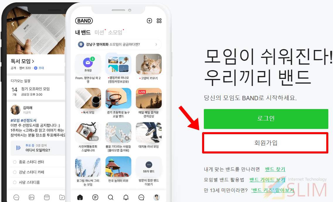 안녕하세요. IT슬림입니다. 오늘 글에서는 네이버 밴드 가입 방법 2가지를 소개드리도록 하겠습니다. 네이버에서 서비스하고 있는 밴드는 관심 주제의 모임으로 활동되는 커뮤니케이션 플랫폼을 말합니다. 그래서 밴드에서는 친구, 동아리, 회사, 지역 소모임 등 다양한 주제로 개설되어 많은 분들이 가입 후 활동을 하게 되는데요. 특히 대다수의 초중고 동창회는 네이버 밴드에서 활동하는 경우가 많아서 가입 초대링크 등이 많이 수신되곤 합니다.