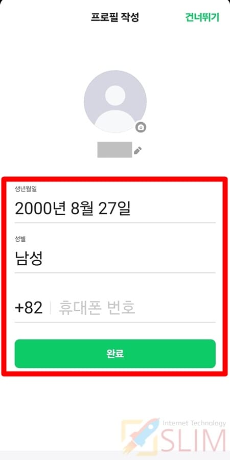 4. 생년월일, 성별, 휴대폰번호를 입력하고 완료를 누릅니다.