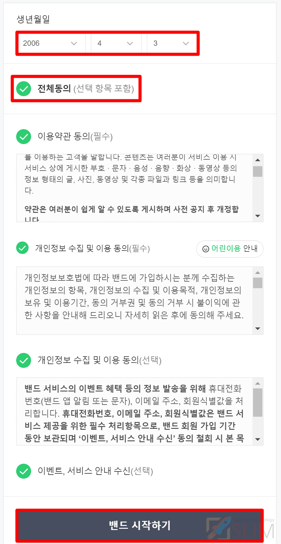 6. 생년월일을 설정하고 전체동의에 체크합니다.
