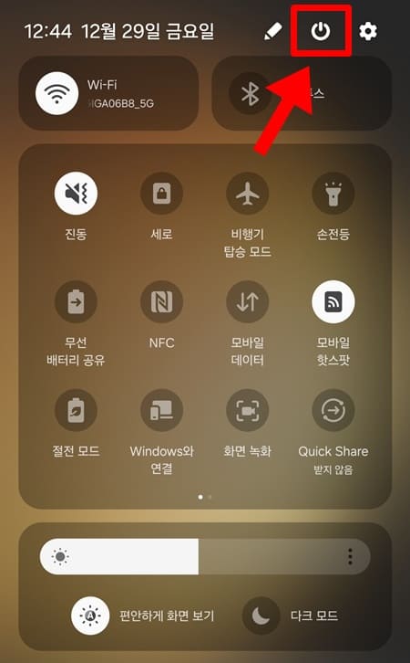 2. 갤럭시 상단바를 아래로 끌어서 내립니다.