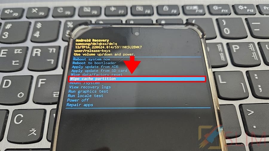 7. 볼륨다운키(-)를 눌러 Wipe Cache partition을 선택합니다.