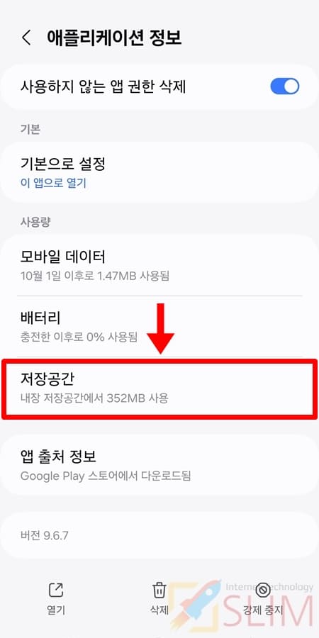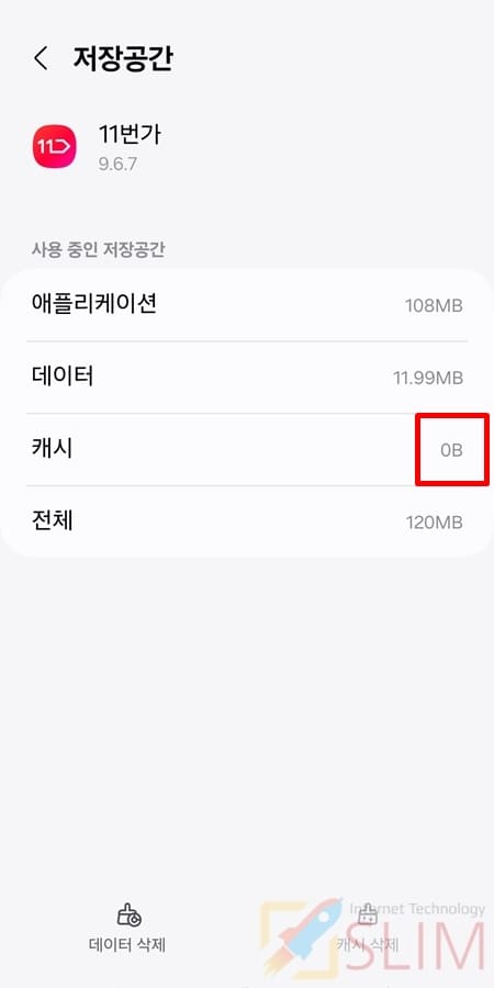 6. 선택 앱의 캐시가 0B로 삭제된 것을 확인할 수 있습니다.