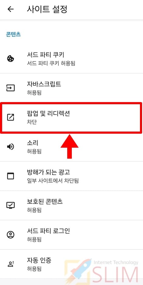 5. 팝업 및 리디렉션을 클릭합니다.
