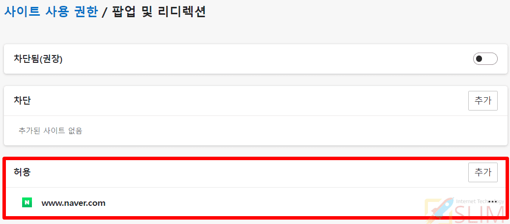5. 설정한 사이트가 엣지 브라우저에서 팝업 허용됩니다.