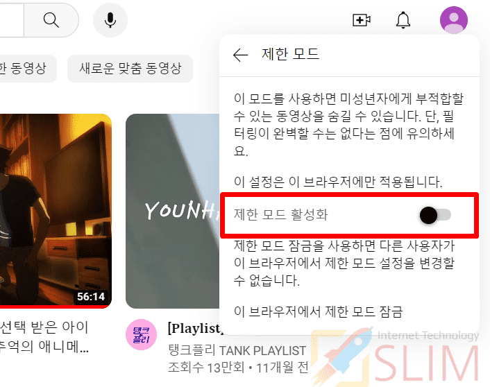 제한모드란 미성년자에게 부적합한 동영상이 자동으로 숨겨지고 재생되지 않게 제한하는 기능을 말합니다. 따라서 이 제한모드가 켜진 상태에서는 유튜브 성인인증 오류가 발생하게 되니 반드시 해제 후 인증 및 사용하시길 바랍니다.