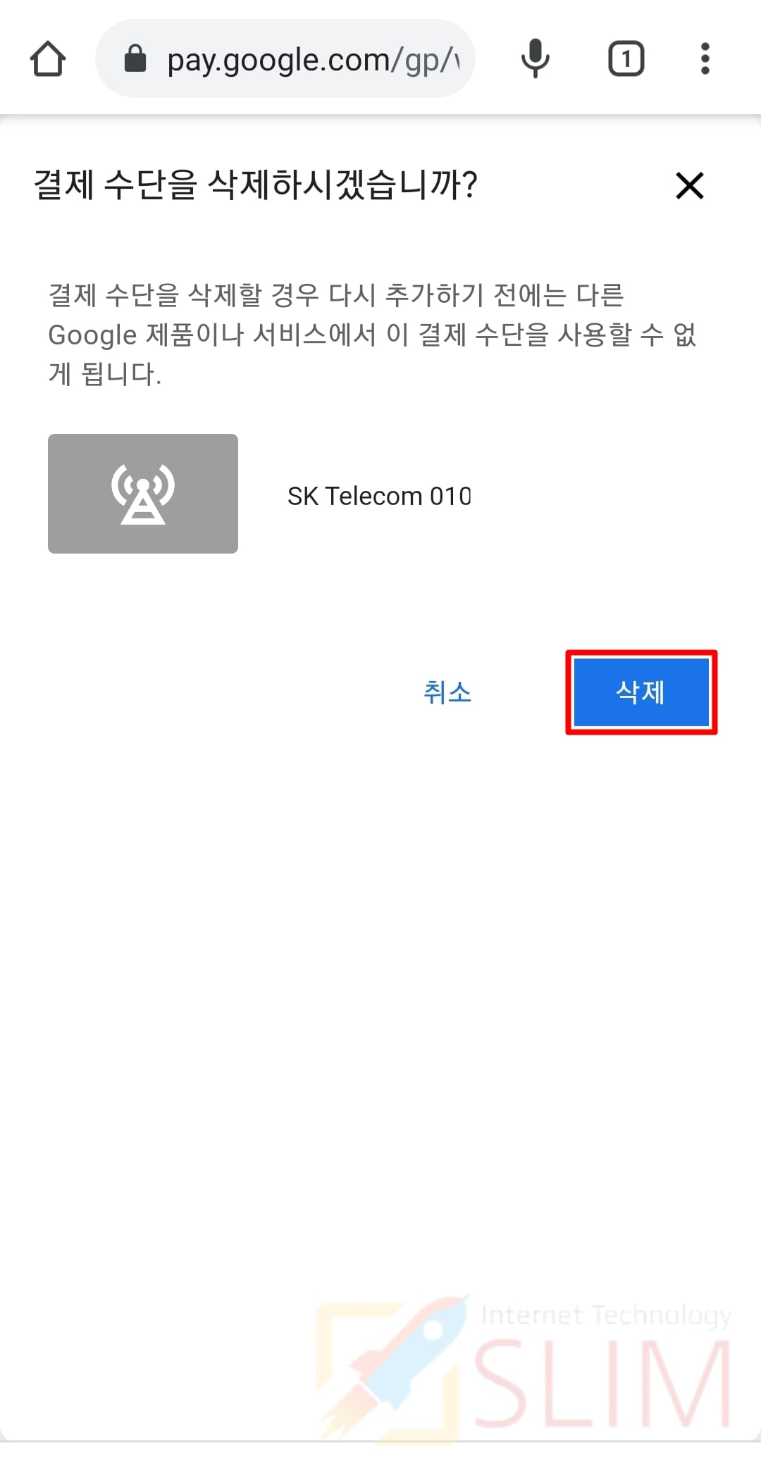 7. 이용을 원하지 않는 결제수단에 삭제를 클릭합니다.