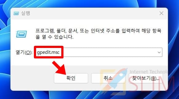 10. gpedit.msc를 입력하고 확인을 누릅니다.