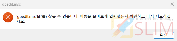 안녕하세요. IT슬림입니다. 오늘 글에서는 gpedit.msc 없음 해결 방법을 소개드리도록 하겠습니다. 윈도우 운영체제에서 로컬 그룹 정책 편집기(GPedit.msc)로 사용자는 시스템 설정을 세밀하게 제어하고 관리할 수 있는데요. 그래서 대부분 윈도우 설정을 변경하는 방법을 보면 gpedit.msc 명령어를 통하여 로컬 그룹 정책 편집기를 이용하는 경우가 많습니다. 그런데 이러한 gpedit.msc는 윈도우 홈 에디션을 포함한 일부 버전에서는 기본적으로 제공하지 않는데요. 그래서 현재 본인이 사용하는 윈도우에서 로컬 그룹 정책 편집기 기능이 지원되지 않는다면 실행시 아래와 같은 팝업이 뜨게 됩니다.