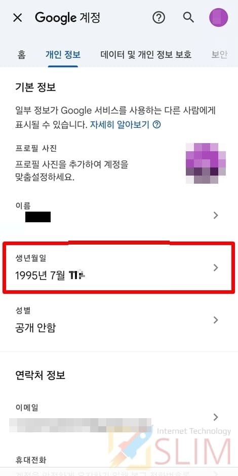 만약 연령제한을 해제하였음에도 19세이상 콘텐츠가 표시되지 않거나 클릭시 재생되지 않는다면 아래의 방법으로 유튜브 구글 계정 나이를 19세 이상으로 변경해주셔야 합니다. 참고로 성인인증시 입력하는 생년월일과 동일해야지만 오류가 발생하지 않으니 꼭 자신의 생년월일에 맞게 변경하시길 바랍니다.