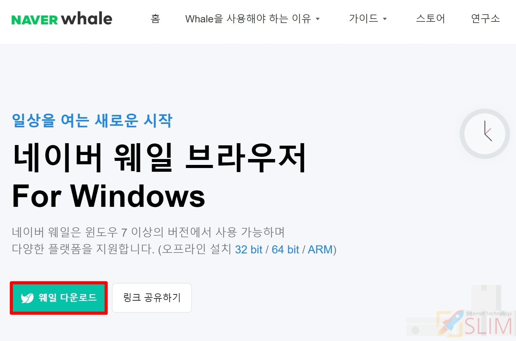 1. PC에서 네이버웨일 사이트에 접속한 후 다운로드받습니다.