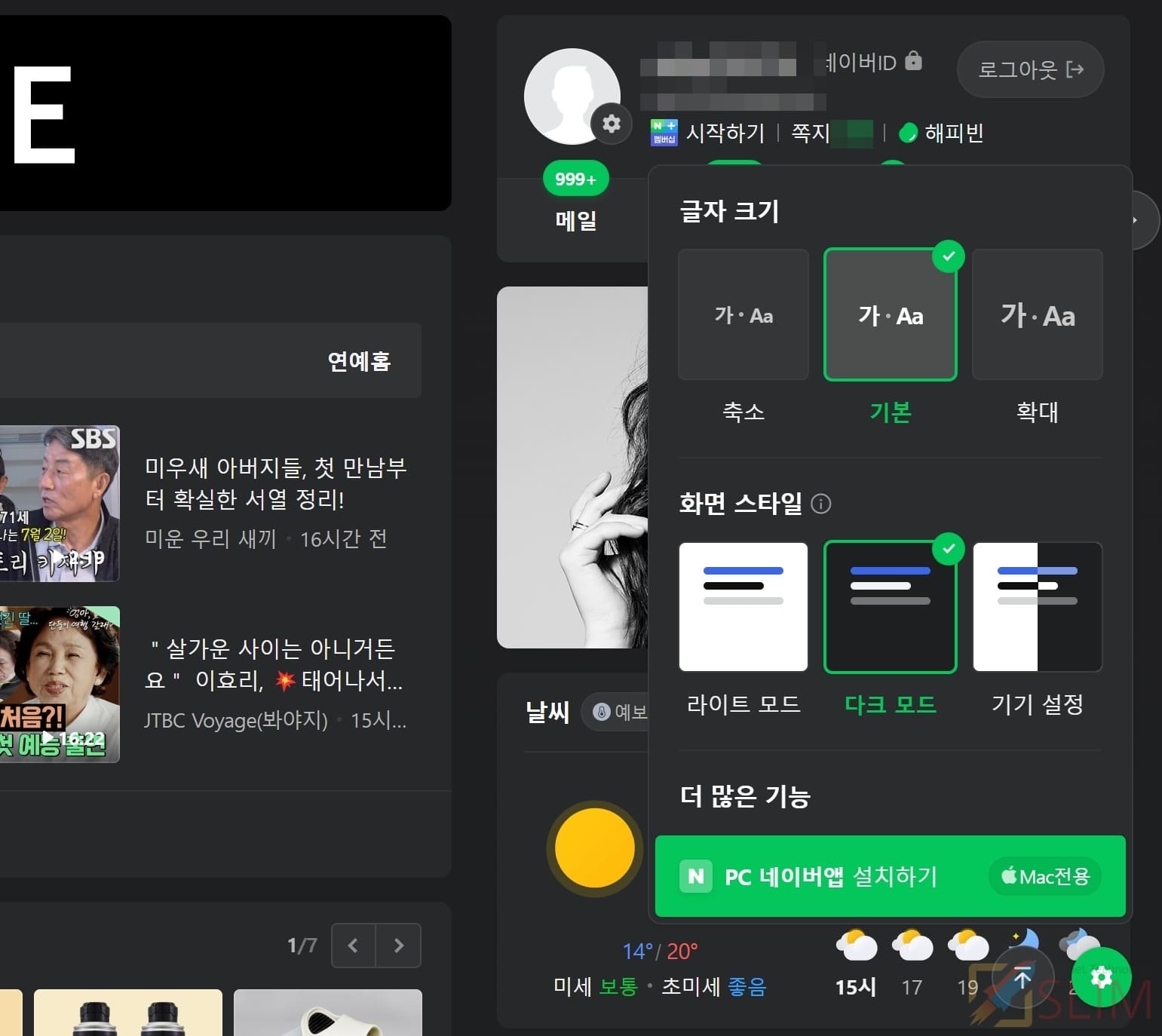 4. 네이버 사이트의 다크모드 설정이 완료되었습니다.