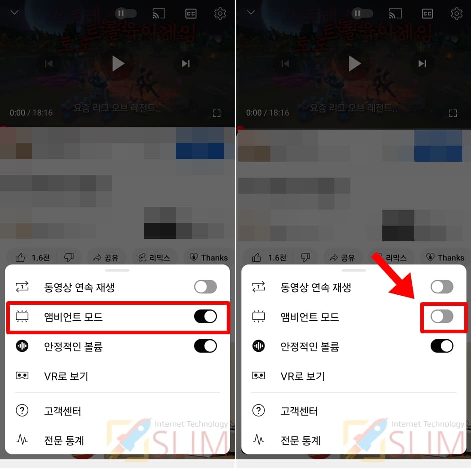 유튜브 앰비언트 모드를 설정하면 유튜브 콘텐츠 화면 주위의 검은색 배경의 색상을 섬세하게 조정하여 더 몰입감있는 시청환경을 만들어주게 됩니다. 그래서 위 사진을 보시면 좌측은 앰비언트 모드를 끈 것이고 우측은 앰비언트 모드를 켠 것으로 차이를 한눈에 확인할 수 있습니다. 이러한 영화관모드 앰비언트는 PC와 모바일에서 모두 설정하거나 끌 수 있어 매우 유용합니다.