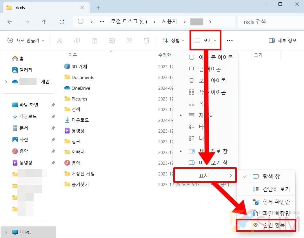 5. 파일탐색기에서 보기 > 표시 > 숨긴 항목을 누릅니다.
