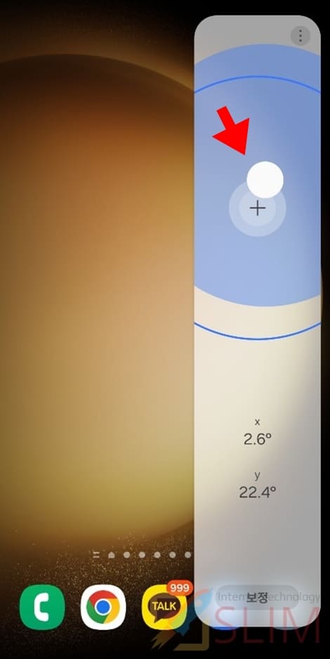 만약 갤럭시 수평계를 더 정확하게 사용하고 싶으시다면 정확히 평평한 곳에 갤럭시를 올린 후 아래의 보정 버튼을 클릭해보세요. 그러면 현재 평평한곳을 기준으로 수평계가 설정되어 사용할 수 있으며 언제든 초기화를 눌러 다시 기본 설정상의 갤럭시 수평계를 사용할 수 있습니다.