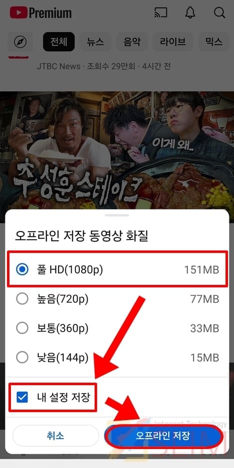 유튜브 오프라인 저장의 화질은 총 4가지로 풀HD(1080P), 높음(720P), 보통(360P), 낮음(144P)가 있습니다. 화질이 높을수록 저장공간을 많이 차지하니 참고하세요.