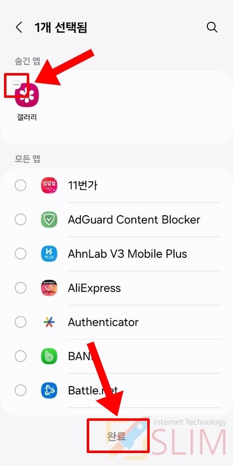 4. 숨긴 앱에 표시된 갤러리 앱에서 - 버튼을 클릭합니다.