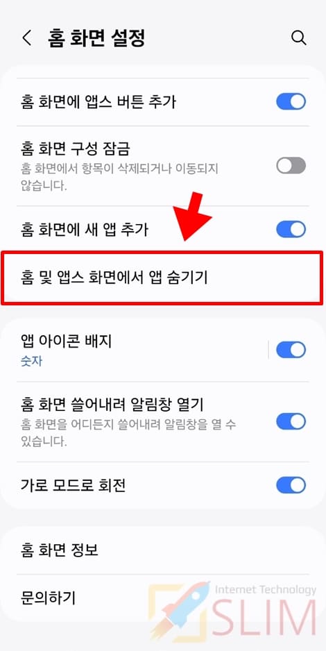 3. 홈 및 앱스 화면에서 앱 숨기기를 클릭합니다.