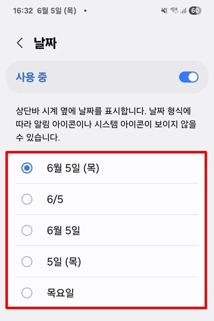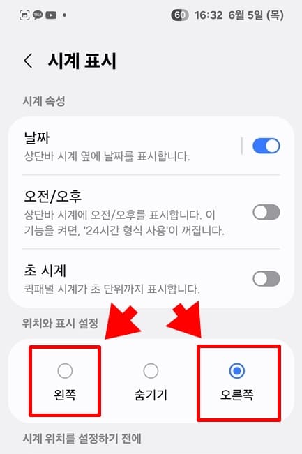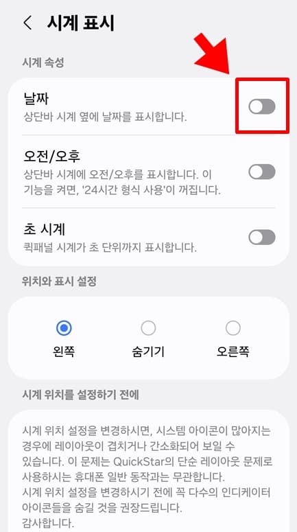 11. 갤럭시 상태표시줄 날짜 설정이 완료되었습니다.
