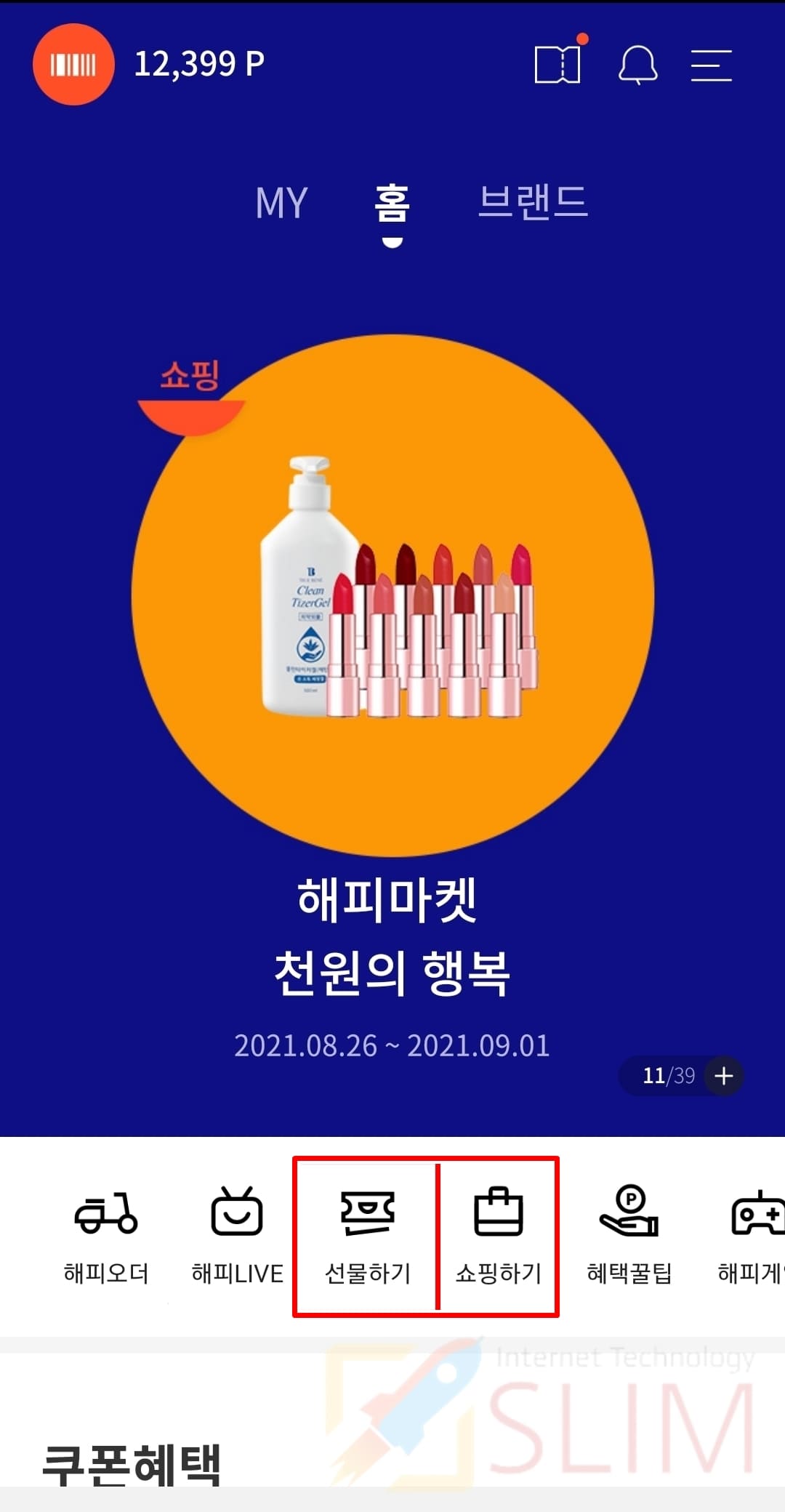1. 해피포인트 앱에서 선물 또는 쇼핑을 누릅니다.