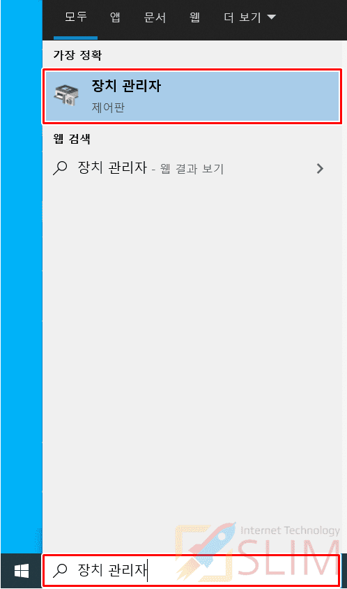 1. 윈도우 검색창에서 장치 관리자를 입력하고 실행합니다.