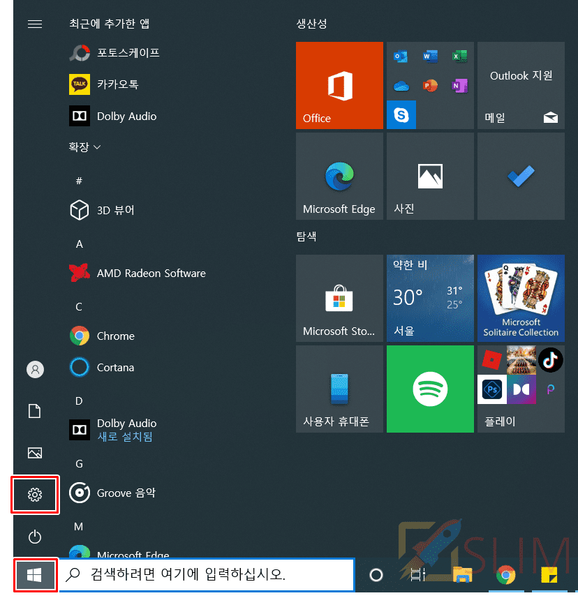 1. 노트북에서 윈도우 버튼을 누르고 설정을 클릭합니다.